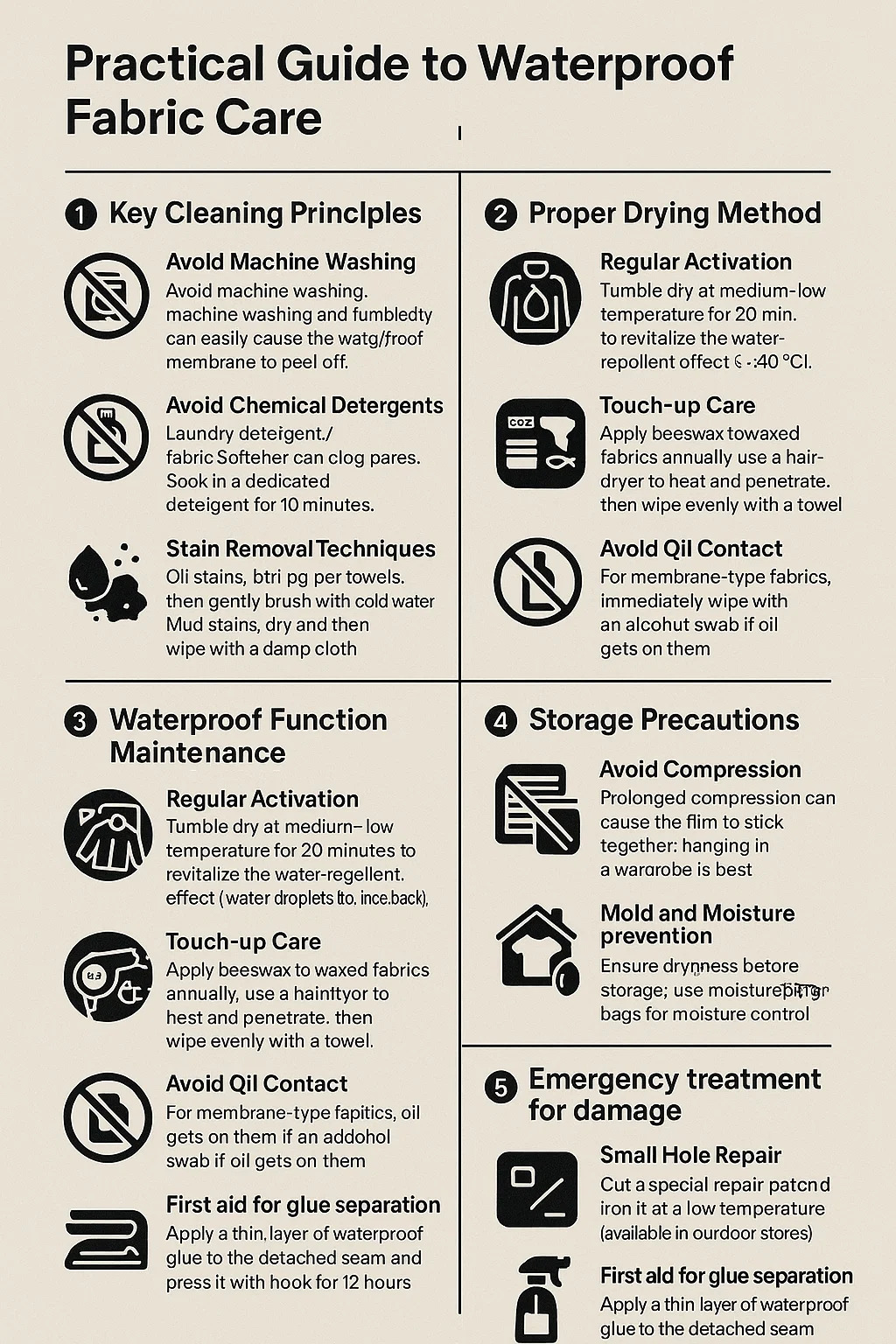 다림질을 피하세요: 고온 다리미는 방수층을 직접적으로 손상시킵니다. 걸면 주름이 사라집니다.
