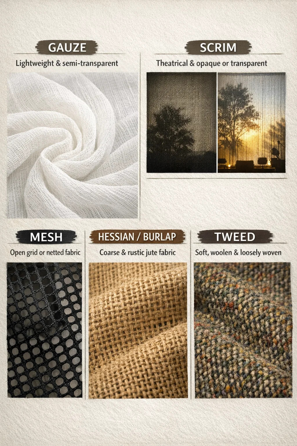 이야기할 때 짠 직물 "느슨한 질감과 큰 간격"으로 인해 용도와 모양에 따라 이를 설명하는 매우 구체적인 용어가 몇 가지 있습니다.