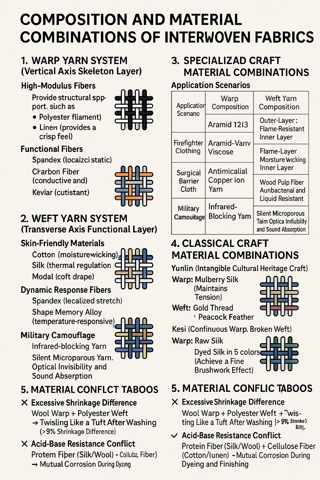 과도한 수축차이 : 양모 경사 폴리에스터 위사 → 세탁 후 뭉치처럼 뒤틀림 (>8% 수축차이)