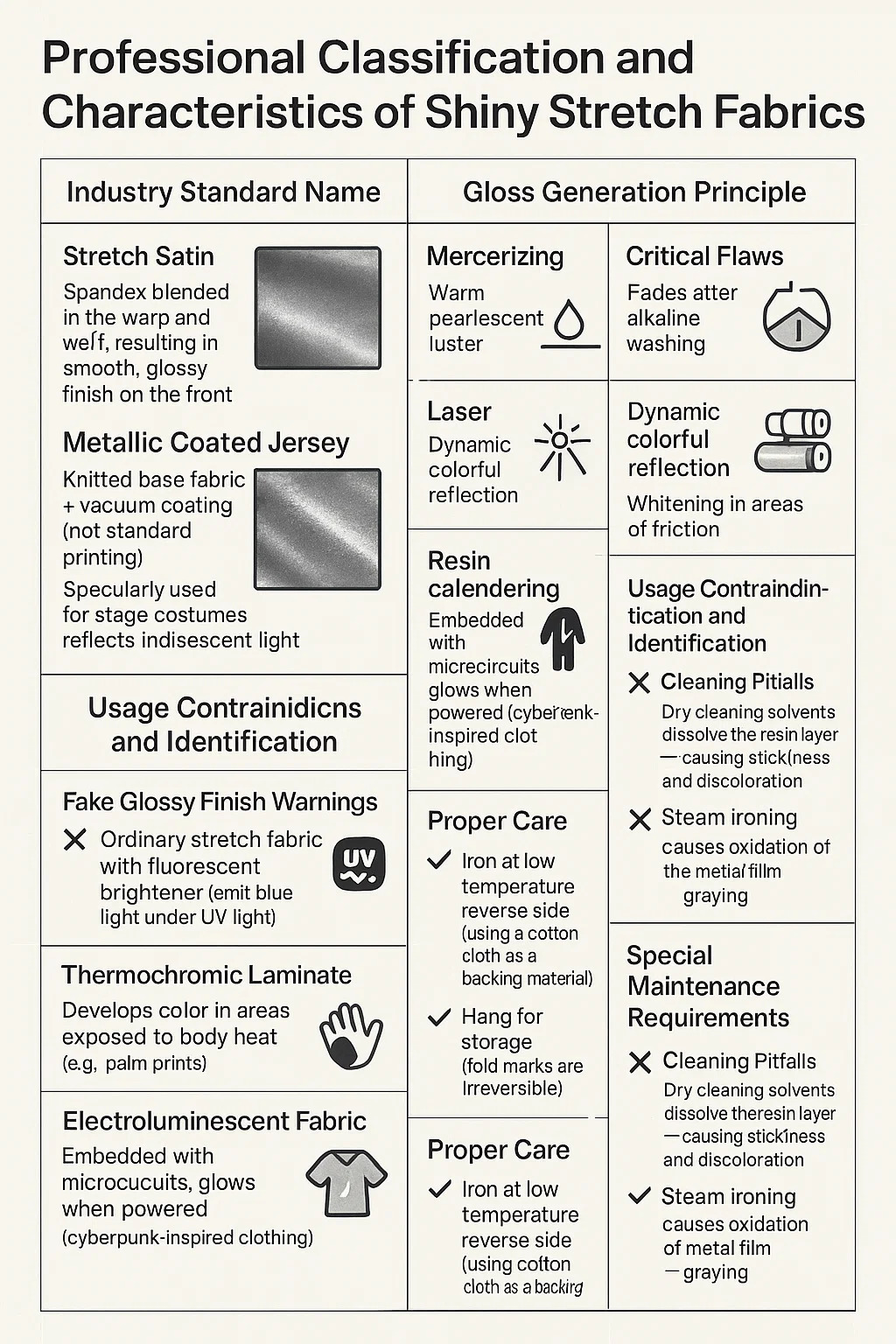 세탁 주의사항: 드라이클리닝 용제는 수지층을 용해 → 끈적거림 및 변색 유발 스팀 다림질은 금속 필름의 산화 → 회색화 유발