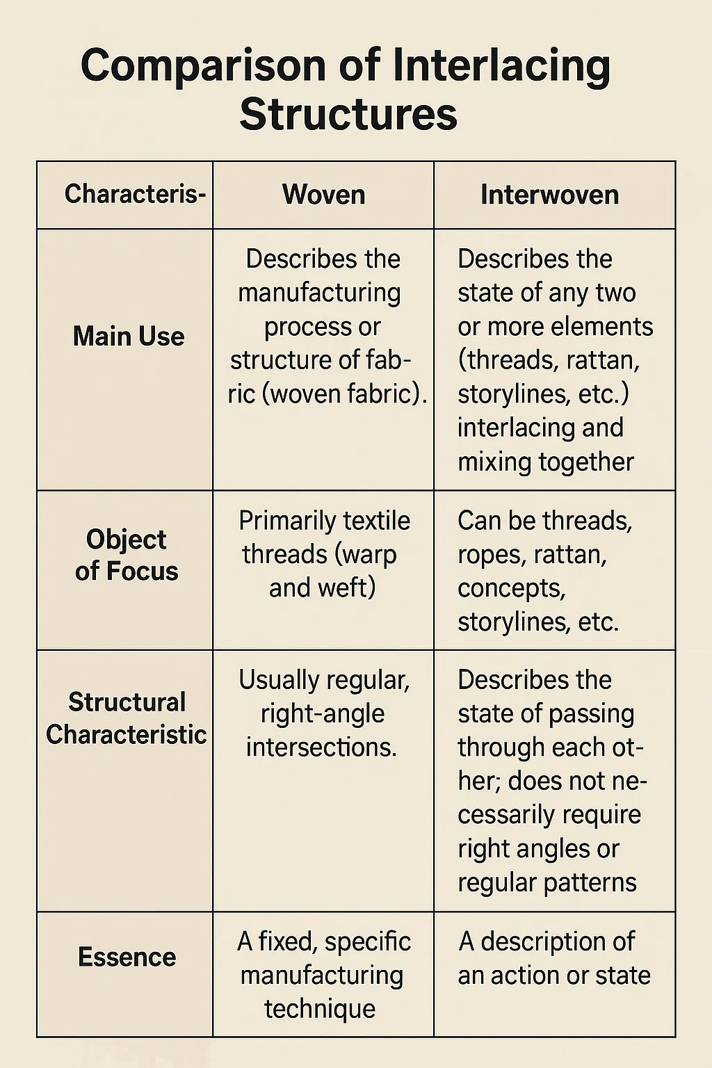 | 주요 용도 | 특정 제조 공정이나 직물(직물)의 완성된 구조를 설명합니다. | 둘 이상의 요소 집합(실, 갈대, 줄거리 등)이 교차되거나 혼합된 상태를 설명합니다. |